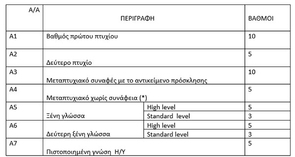 (*) Σε περίπτωση που υποψήφιος κατέχει δύο μεταπτυχιακά, προσμετράται μόνο αυτό που του δίνει τα περισσότερα μόρια.