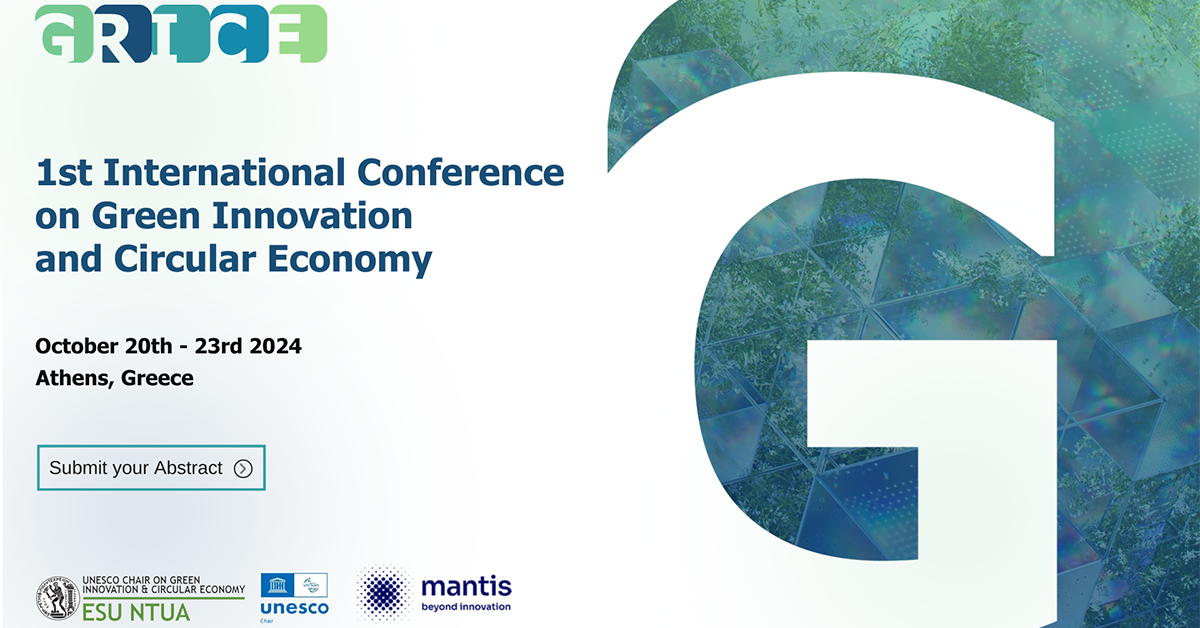 Το 1ο Διεθνές Συνέδριο για την Πράσινη Καινοτομία και την Κυκλική Οικονομία (GR-I-CE 2024) θα πραγματοποιηθεί από τις 20 έως τις 23 Οκτωβρίου 2024, στην Αθήνα. Το συνέδριο διοργανώνεται από την Έδρα UNESCO για την Πράσινη Καινοτομία και την Κυκλική Οικονομία του Εθνικού Μετσόβιου Πολυτεχνείου και την Mantis Beyond Innovation.