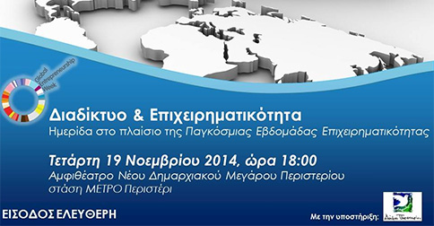 Στο πλαίσιο της Παγκόσμιας Εβδομάδας Επιχειρηματικότητας και με την υποστήριξη του Δήμου Περιστερίου, η Quantum Business & IT Solutions διοργανώνει ενημερωτική ημερίδα με θέμα «Διαδίκτυο & Επιχειρηματικότητα» την Τετάρτη 19 Νοεμβρίου 2014 και ώρα 18:00 στο Αμφιθέατρο του Νέου Δημαρχιακού Μεγάρου Περιστερίου (στάση Μετρό: Περιστέρι).