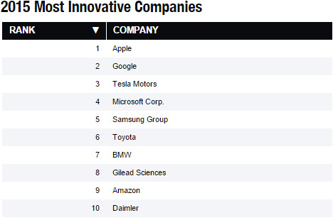 Η Boston Consulting Group κατάρτισε για δέκατη χρονιά την ετήσια λίστα με τις πιο καινοτόμες επιχειρήσεις σε όλον τον κόσμο. Η λίστα καταρτίζεται βάσει των αξιολογήσεων 1.500 διευθυντικών στελεχών επιχειρήσεων.