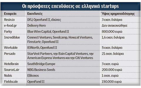 Ο υπολογισμός είναι δύσκολο να γίνει καθώς σε ορισμένες περιπτώσεις, όπως είναι αυτή του e-food.gr, το ύψος της επένδυσης δεν ανακοινώθηκε ούτε έχει υπάρξει διασταύρωση των ποσών που ακούστηκαν. Τα επενδυτικά κεφάλαια που βλέπουν τις ελληνικές startups προέρχονται κυρίως από τις Ηνωμένες Πολιτείες και τη Βρετανία, ενώ υπάρχουν και ορισμένες περιπτώσεις επενδύσεων από Γερμανία ή Ισραήλ.