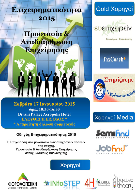 Το Σάββατο 17 Ιανουαρίου 2015 θα διεξαχθεί στην Αθήνα και συγκεκριμένα στο DIVANI PALACE ACROPOLIS HOTEL το Συνέδριο Επιχειρηματικότητα 2015. Διοργανωτής του Συνεδρίου είναι η Ευεπιχειρείν και το Taxcoach.