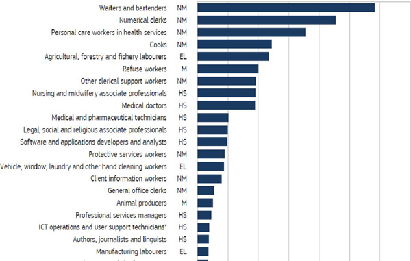 Τα επαγγέλματα με την καλύτερη απορροφητικότητα στην ευρωπαϊκή αγορά εργασίας είναι οι πωλητές καταστημάτων (3 εκατομμύρια προσλήψεις), οι υπάλληλοι ξενοδοχείων (2,3 εκατ. προσλήψεις), οι σερβιτόροι (1,8 εκατ. προσλήψεις), οι εργαζόμενοι στον κλάδο της προσωπικής φροντίδας (1,4 εκατ.) και οι εργαζόμενοι στον οικοδομικό – κατασκευαστικό κλάδο (1,1 εκατ.).