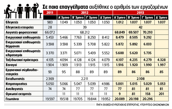 Στον παραπάνω πίνακα της Έκθεσης της Ευρωπαϊκής Επιτροπής, ο οποίος δημοσιεύθηκε από το Υπουργείο Οικονομικών, καταγράφονται τα επαγγέλματα στα οποία κατά τα έτη 2012-2013 αυξήθηκαν οι εργαζόμενοι.