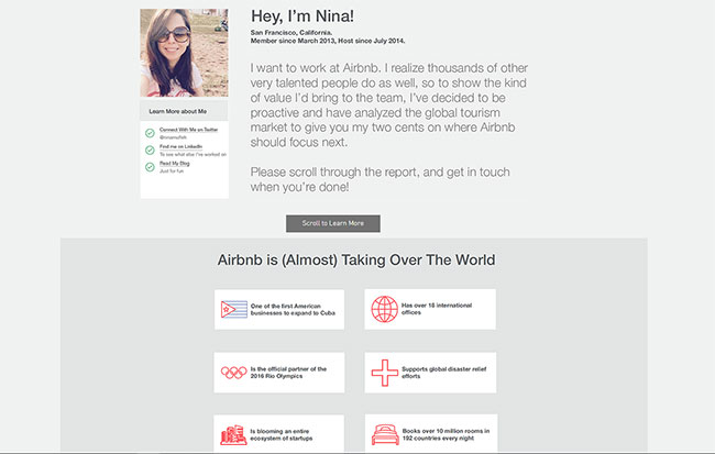 Προσπάθησε να έρθει σε επαφή με την εταιρεία μέσω email και αγγελιών για θέσεις εργασίας αλλά η προσπάθειά της δεν απέδωσε καρπούς. Οπότε αποφάσισε να πάει την έρευνά της στο επόμενο επίπεδο δημιουργώντας ένα φανταστικό βιογραφικό που αντανακλά την ιστοσελίδα της Airbnb.